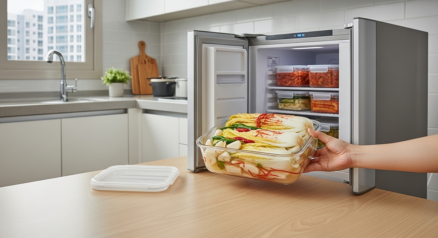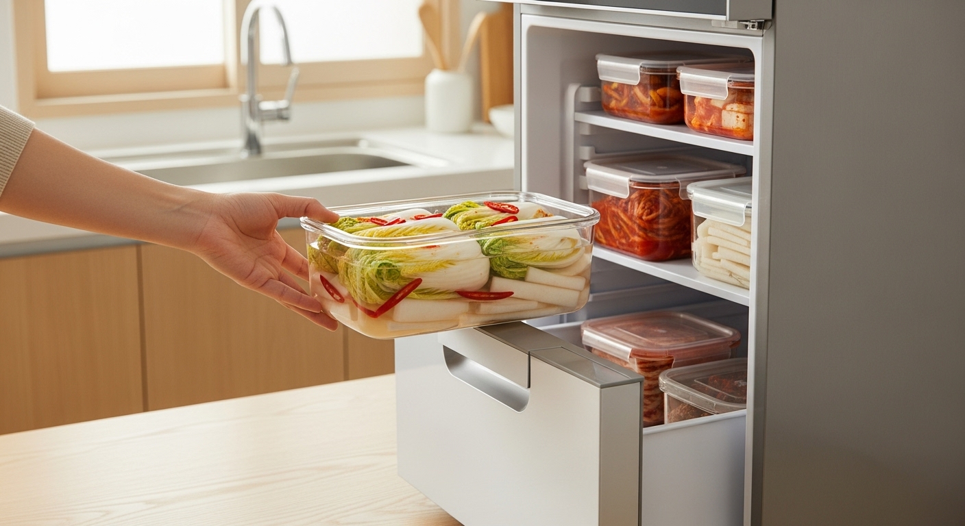 - 뚜껑을 살짝 열어 하루 실온 숙성 후 김치냉장고로 이동