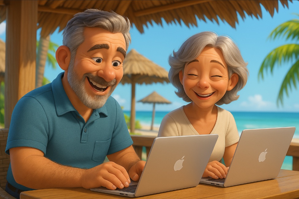 예를 들어, 해변 카페에서 노트북으로 작업 중인 중년 부부의 사진을 픽사 스타일로 변환하면, 입체감 있고 부드러운 캐릭터 스타일로 표현된 장면이 완성됩니다.
